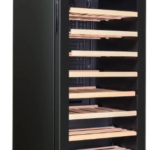 Storage is versatile with glass shelves at the top, a 45° display shelf, and sliding wooden shelves at the bottom, allowing for elegant display and easy access. Fan-assisted cooling ensures even temperature distribution, with adjustable ranges of 2°C to 18°C for both top and bottom compartments.